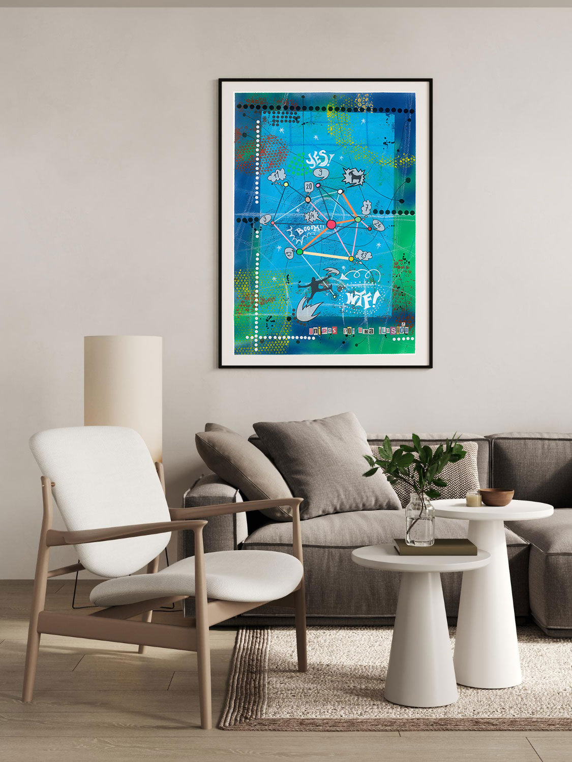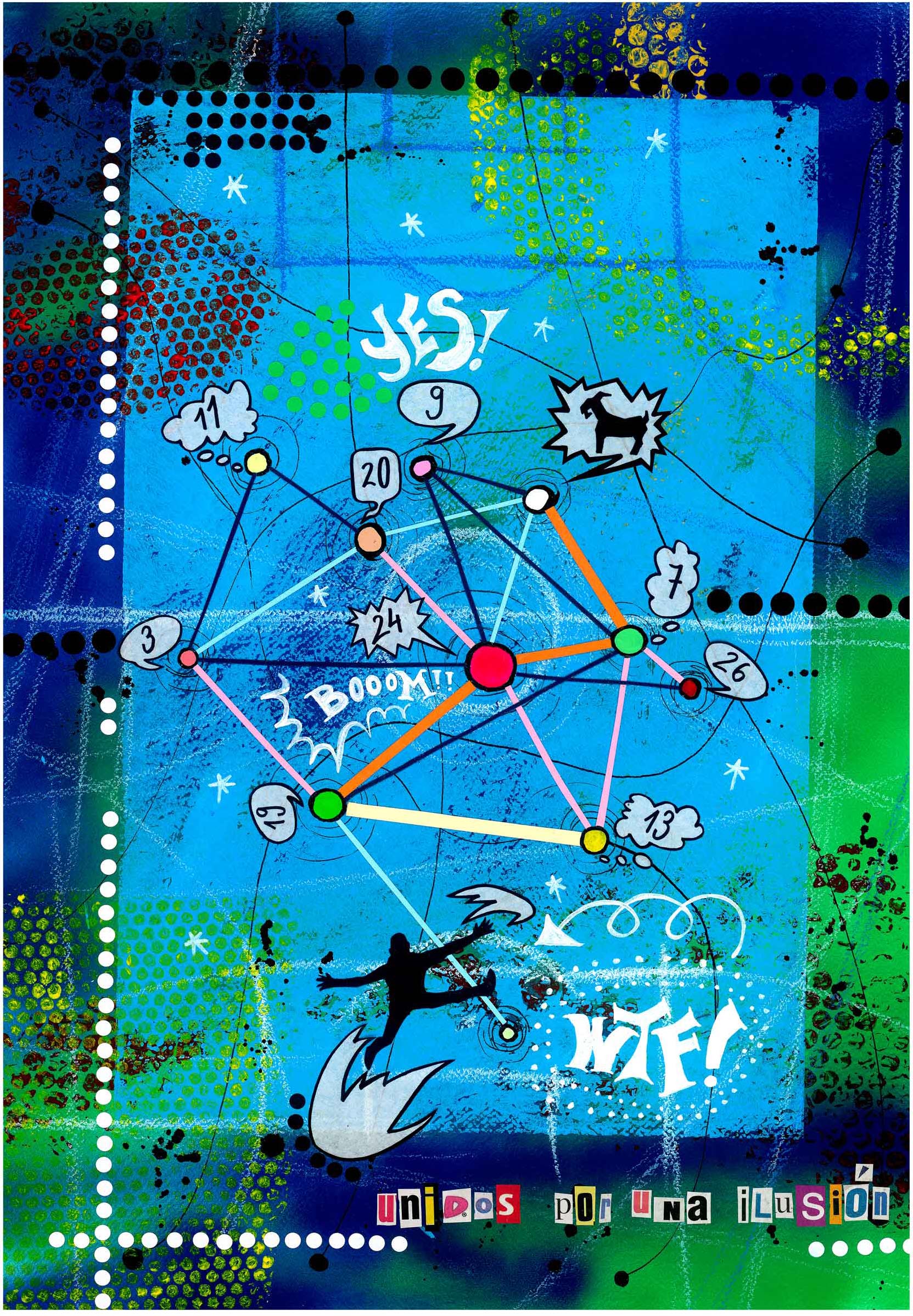 The original visualisation was associated with a constellation. Each player is a star, and through their relationships they form a large constellation, which the artist has visualised in a playful, comic form. Of course, the GOAT himself and the goalkeeper's phenomenal save in the last minutes of the World Cup final could not be left out of the painting.
