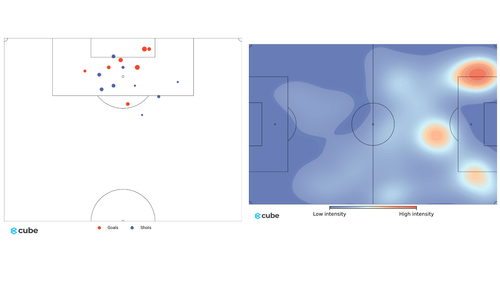 The metric xT – expected threat is measuring how a pass or a ball carry increased the probality of a team scoring a goal. The xT heatmap shows which areas on the pitch was used by the team for creating more threating actions.