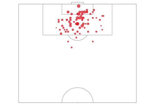 The bigger a dot is, the higher xG (expected goals) value that specific goal had, representing the probability of a similar shot resulting a goal.